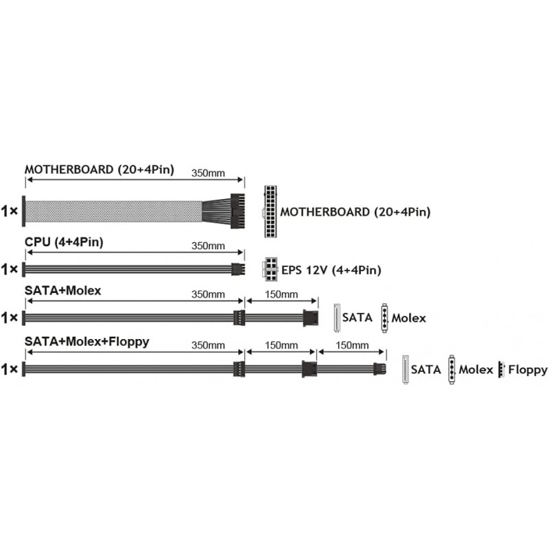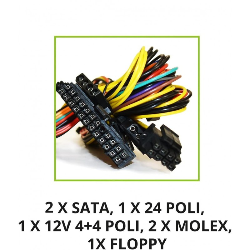 Conectores Versáteis: Equipada com todos os conectores necessários, incluindo 2 x SATA, 1 x 24 pólos, 1 x 12 V 4 pólos, 2 x Molex e 1 x Floppy, facilitando a conexão de diversos componentes.