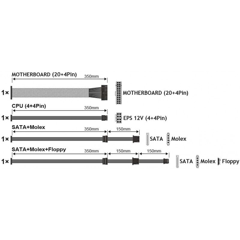 Conectividade Ideal: Equipada com uma diversidade de conectores, incluindo 2 x SATA, 1 x 24 pólos, 1 x 12 V 4 pólos, 2 x Molex e 1 x Floppy, facilitando a conexão a diferentes componentes.