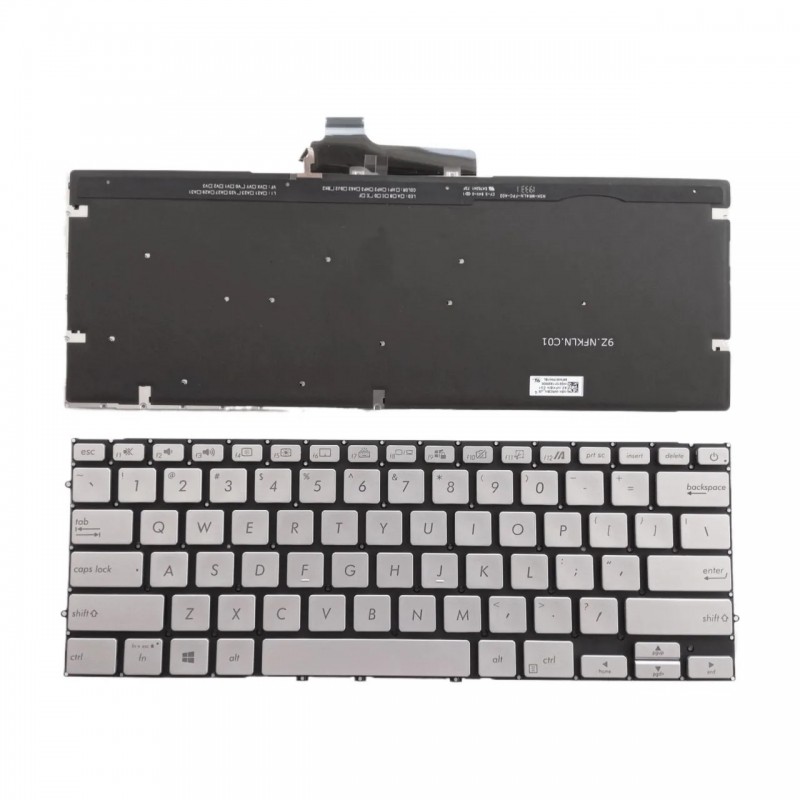 Teclado em layout português (PT), sem retroiluminação, compatível com vários modelos do portátil ASUS ZenBook 14. Cor prateada. Ideal para substituição em caso de avaria ou desgaste.