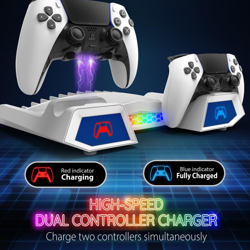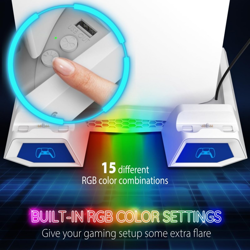 Estação de arrefecimento multifuncional para PS5/PS5 Slim com carregador dual para comandos, iluminação RGB com 15 combinações de cores e suporte integrado para auscultadores e jogos. Organização prática e design elegante para uma experiência de jogo otimizada.