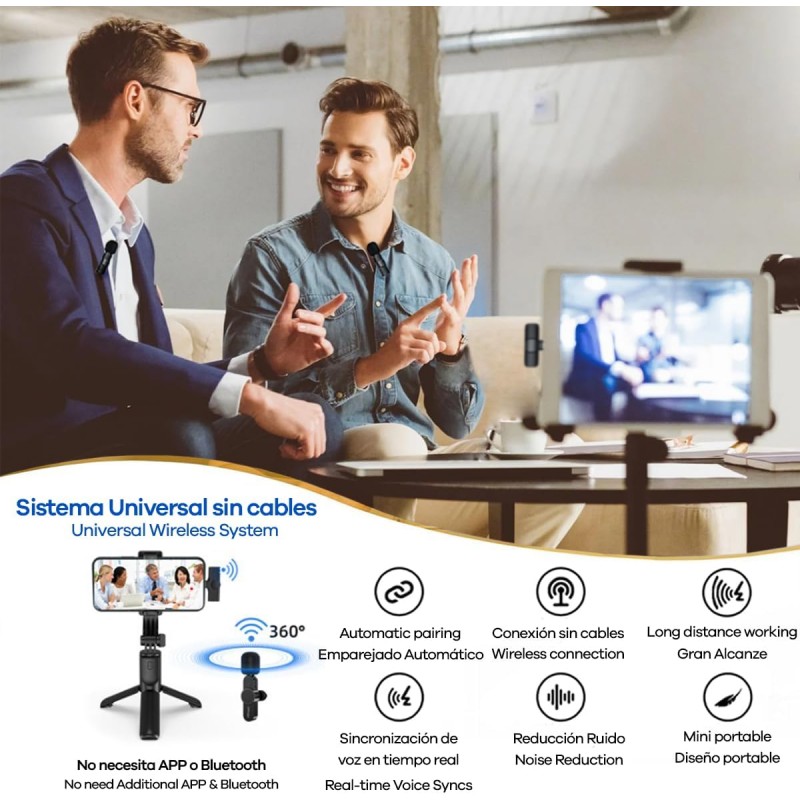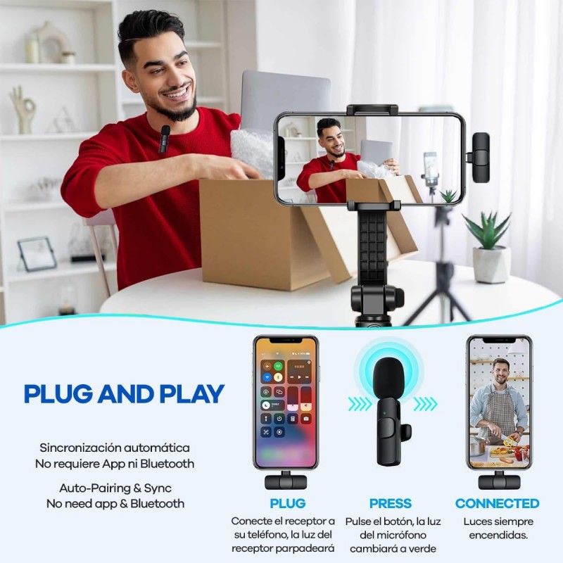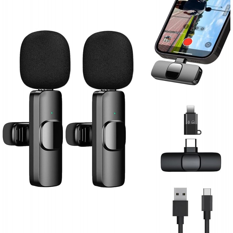 Microfones de Lapela Sem Fios Profissionais - Pack Duplo Plug&Play para iPhone, Android, iPad - Ideal para Vídeo, Vlog, Podcast e Transmissões Ao Vivo