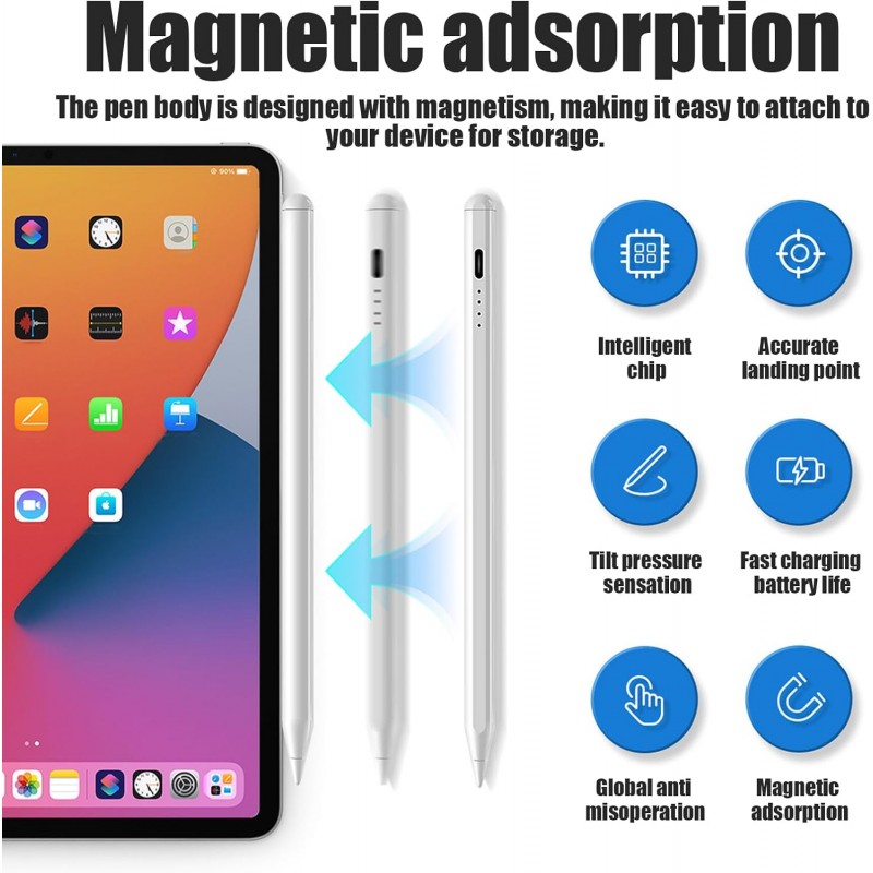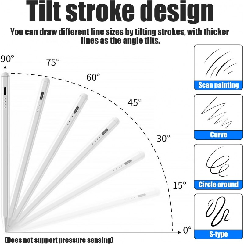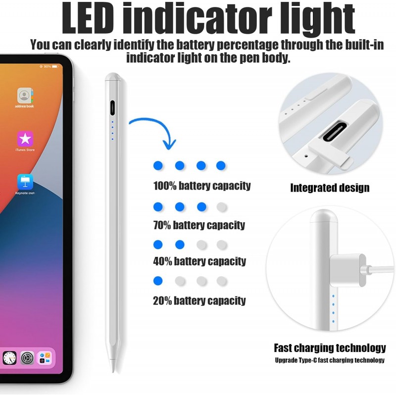 Caneta recarregável para iPad com função de inclinação, rejeição de palma, carregamento rápido USB-C, indicador LED e 3 pontas de substituição. Compatível com modelos de 2018 a 2024.