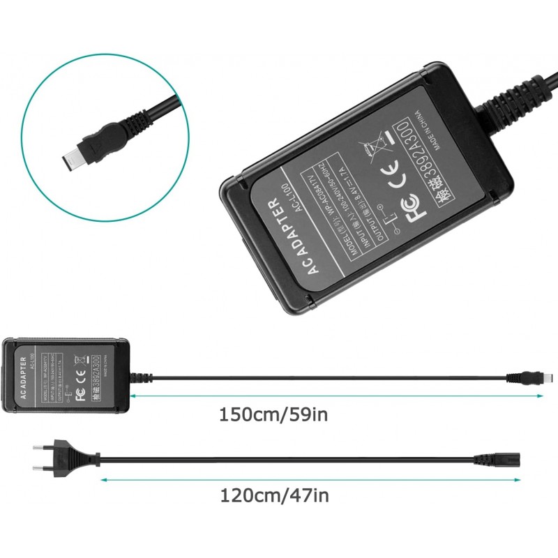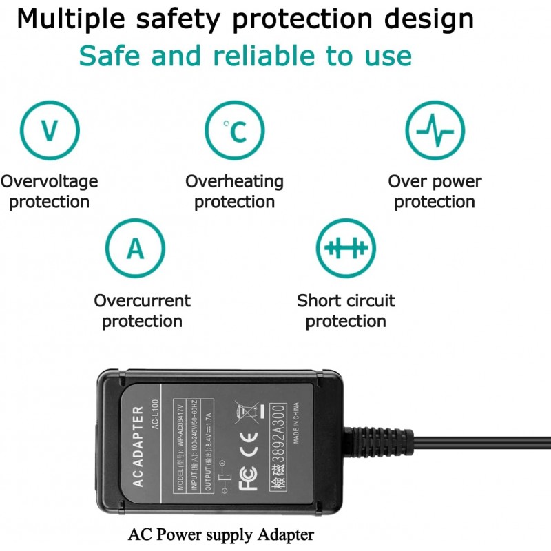 A fonte de alimentação compatível com AC-L100 é a solução ideal para substituir ou ter como reserva o carregador original da sua câmara Sony. Com tensão de entrada de 100 a 240 volts (50-60 Hz) e saída de 8,4 volts a 1,7 amperes, esta fonte é compatível com uma vasta gama de modelos, garantindo carregamento seguro e estável.