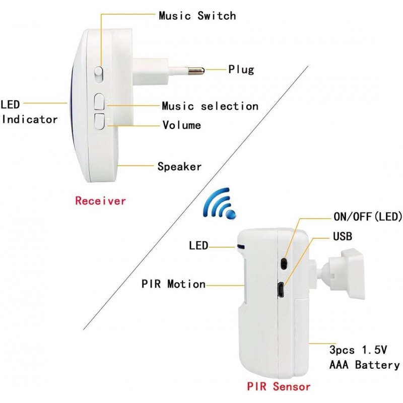 Campainha sem fios equipada com sensor de movimento PIR infravermelho que deteta a presença de pessoas num raio entre 3 a 7 metros e num ângulo de 110 graus. Quando o sensor é ativado, envia sinal ao recetor que emite som e luz de aviso.
