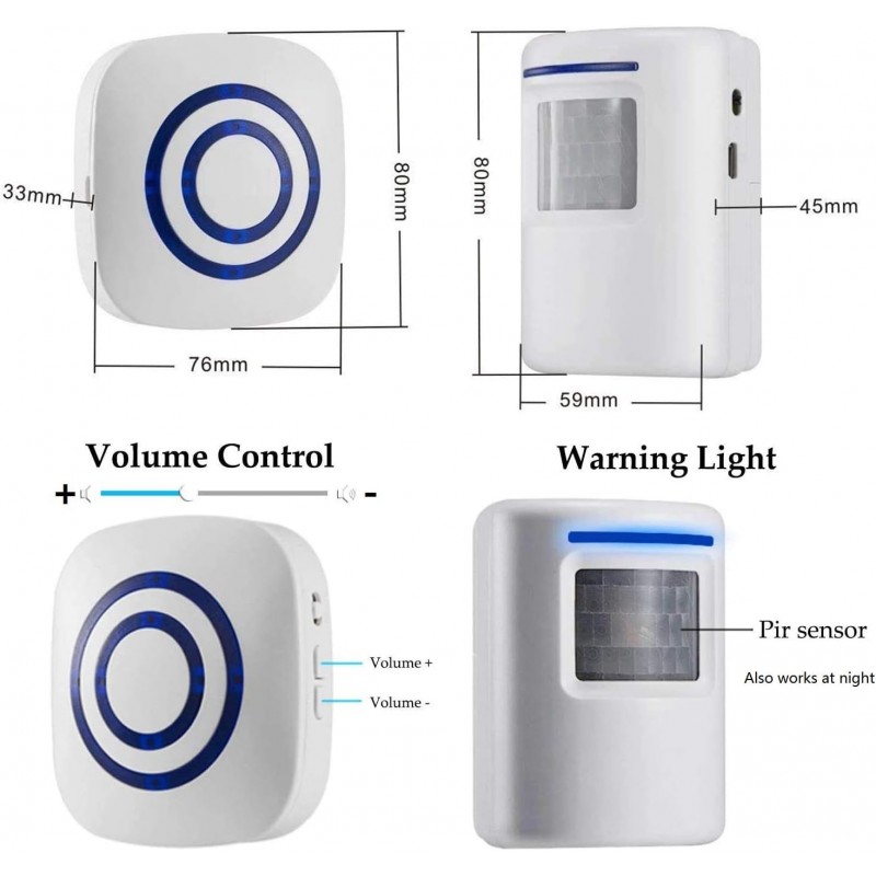Este sistema é ideal para monitorizar a entrada de lojas, escritórios, armazéns, hotéis ou mesmo a porta de entrada de casa. Pode escolher entre 38 tons de aviso e ajustar o volume entre três níveis: alto, médio e silencioso.