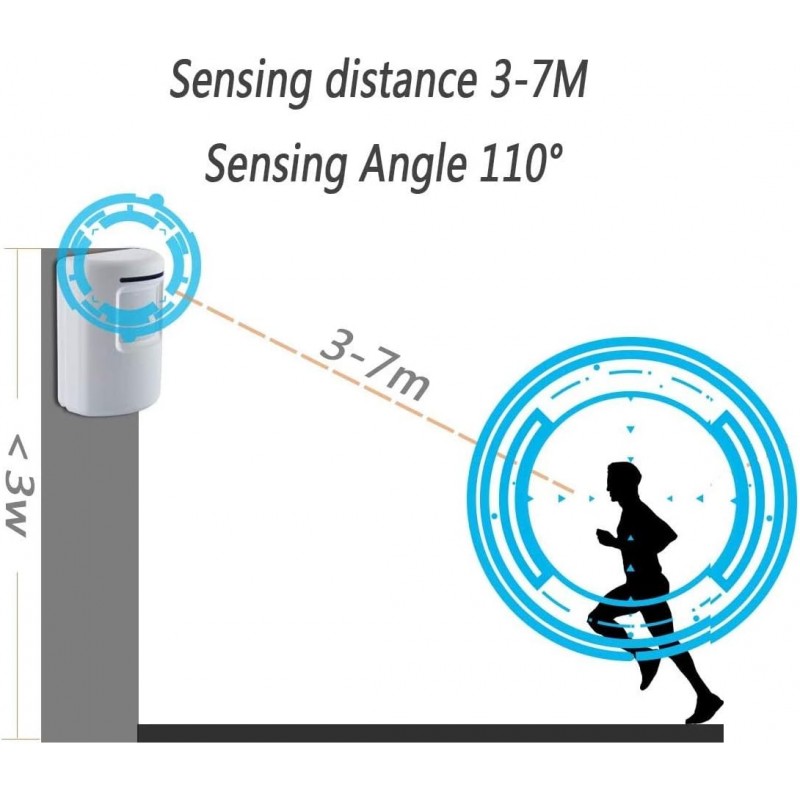 Sistema de alarme sem fios com sensor de movimento PIR de alta sensibilidade. Ideal para lojas, escritórios, hotéis e residências. Deteta movimento até 7 metros e emite aviso sonoro com 38 tons disponíveis.