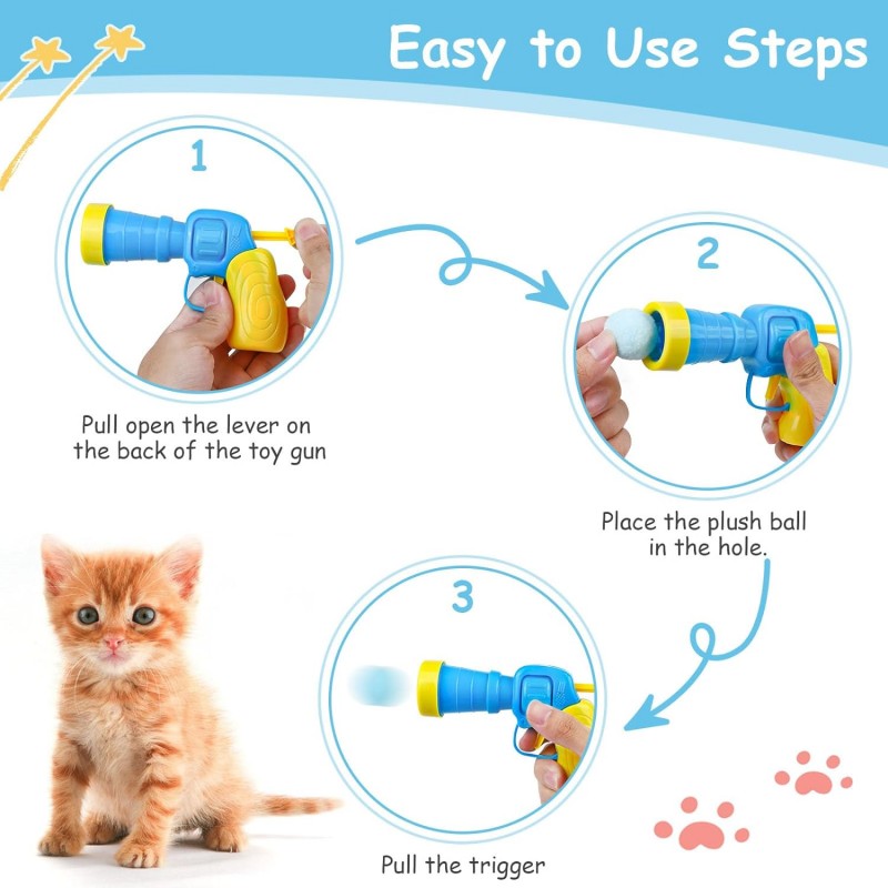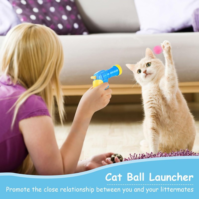 Este conjunto inclui uma pistola lança bolas de plástico resistente e 100 bolas de pelúcia coloridas, proporcionando entretenimento contínuo e estimulante para o seu amigo felino.