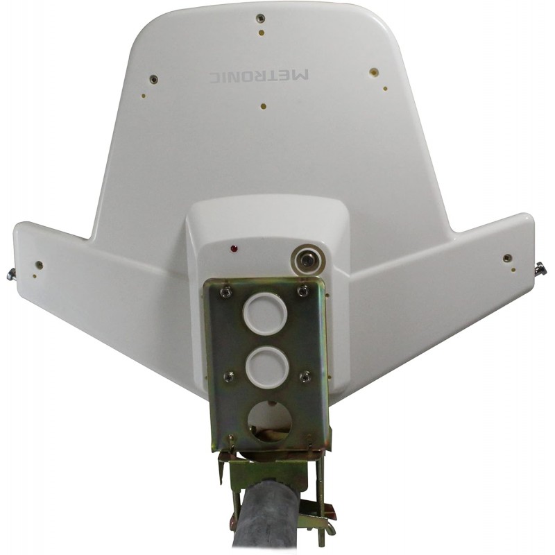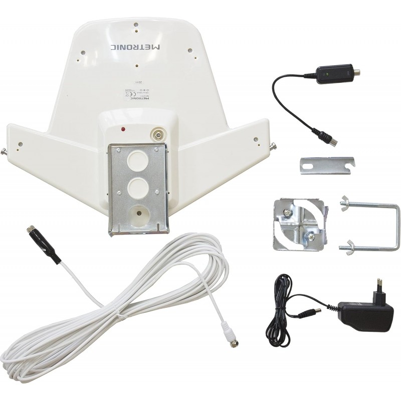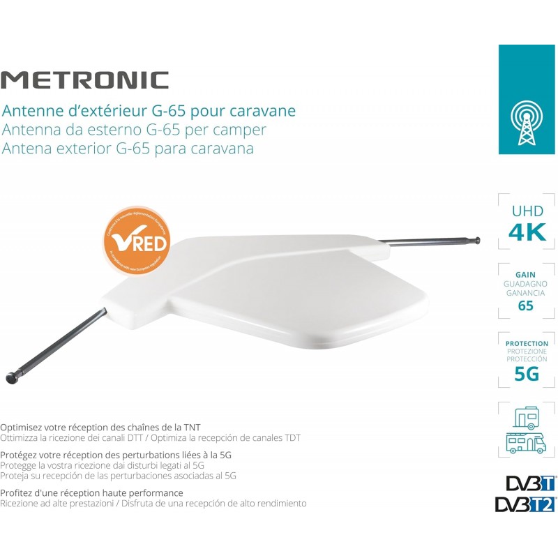 Antena TDT exterior Metronic 427018, ideal para caravanas e campismo. Compatível com 5G e DVB-T/T-2. Ganho de 65 (18,1 dB), tomada F, alcance de 400 metros, cor branca. Inclui cabo de 10 m.