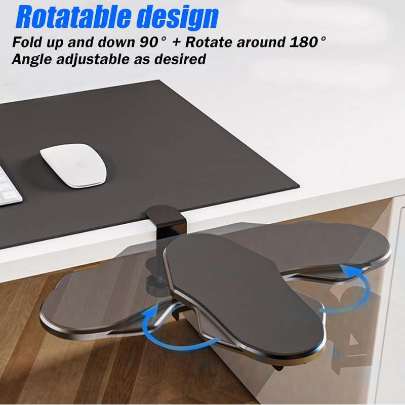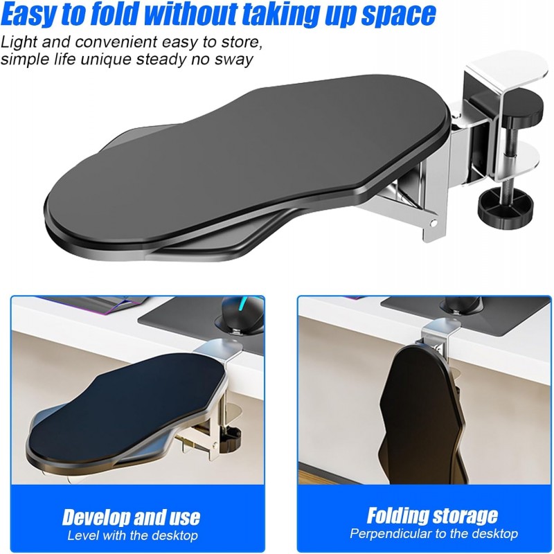 Apoio de braço ajustável para computador, aliviando os músculos do ombro e proporcionando conforto ergonómico. Fabricado em metal e plástico, com design dobrável para uso personalizado em casa ou no escritório.