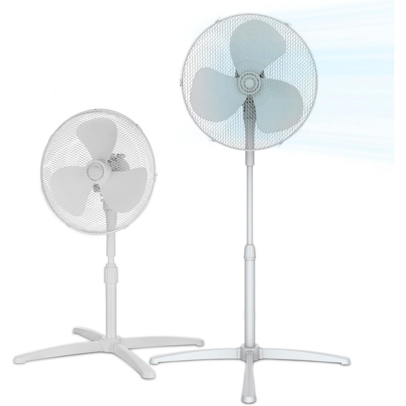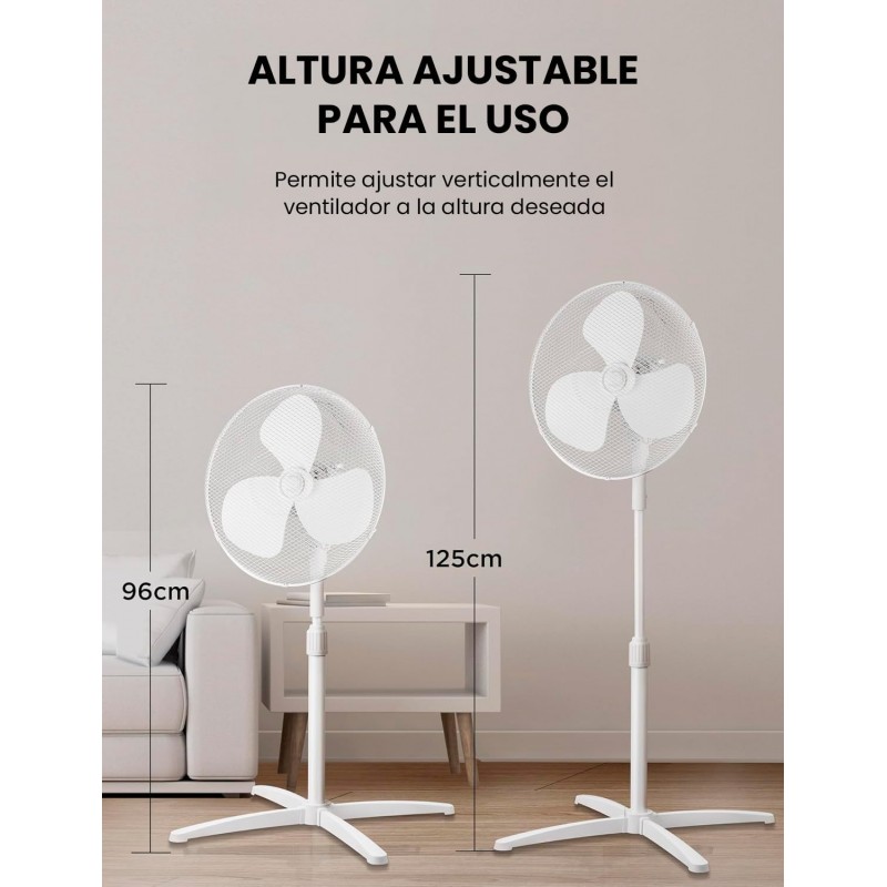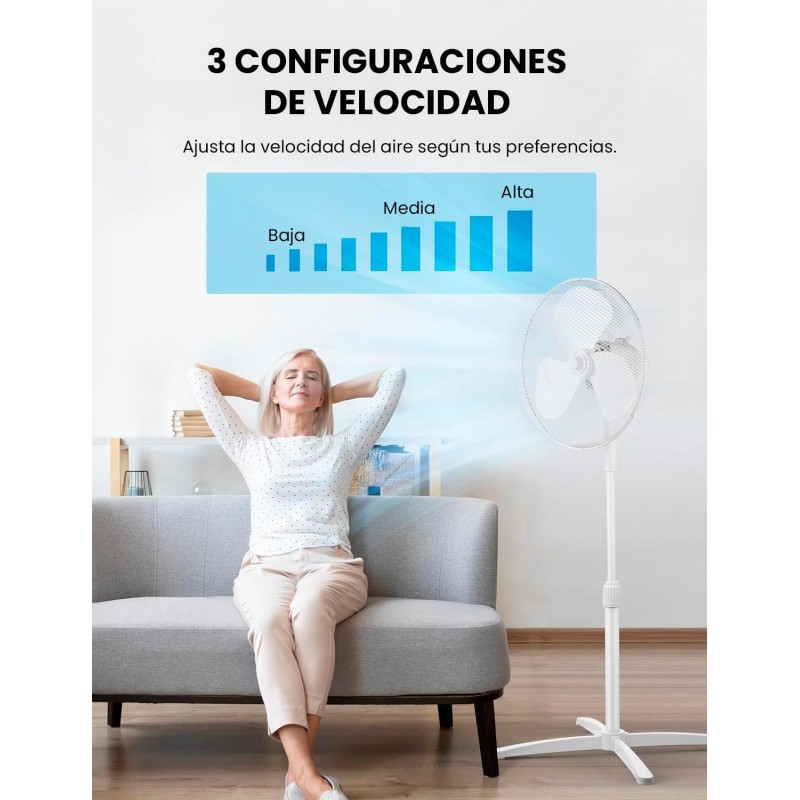 Ventoinha de pé com motor de cobre, 3 velocidades, oscilação de 90º, altura ajustável até 125 cm e fluxo de ar potente de 40 m³/min. Leve e fácil de transportar.