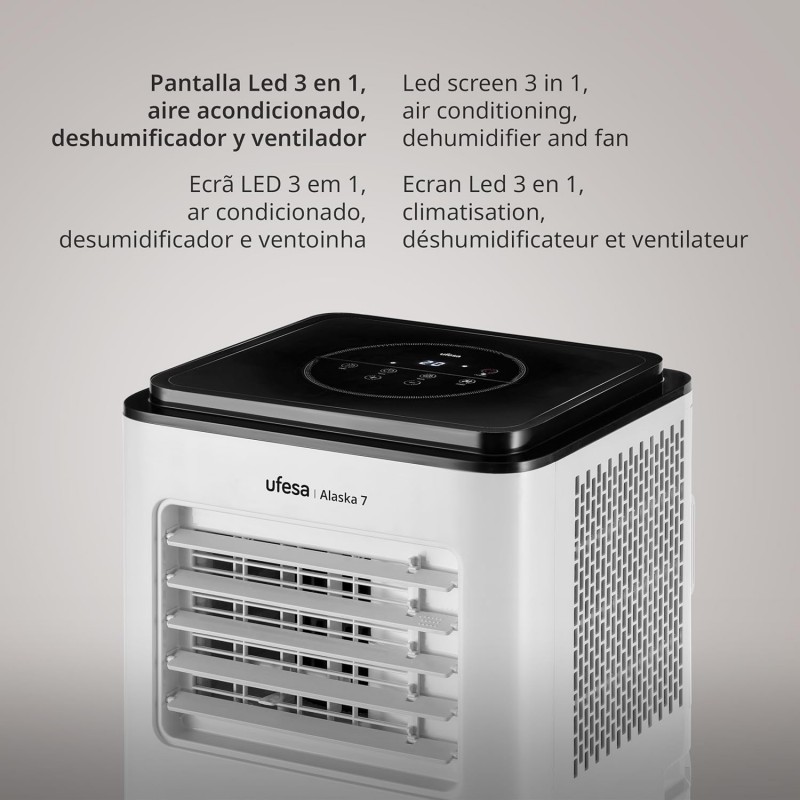 Ar condicionado portátil Ufesa A7 3 em 1 com função de refrigeração, ventilação e desumidificação. 7000 BTU, ideal para áreas até 12 m². Controlo remoto, temporizador de 24h e ecrã LED.