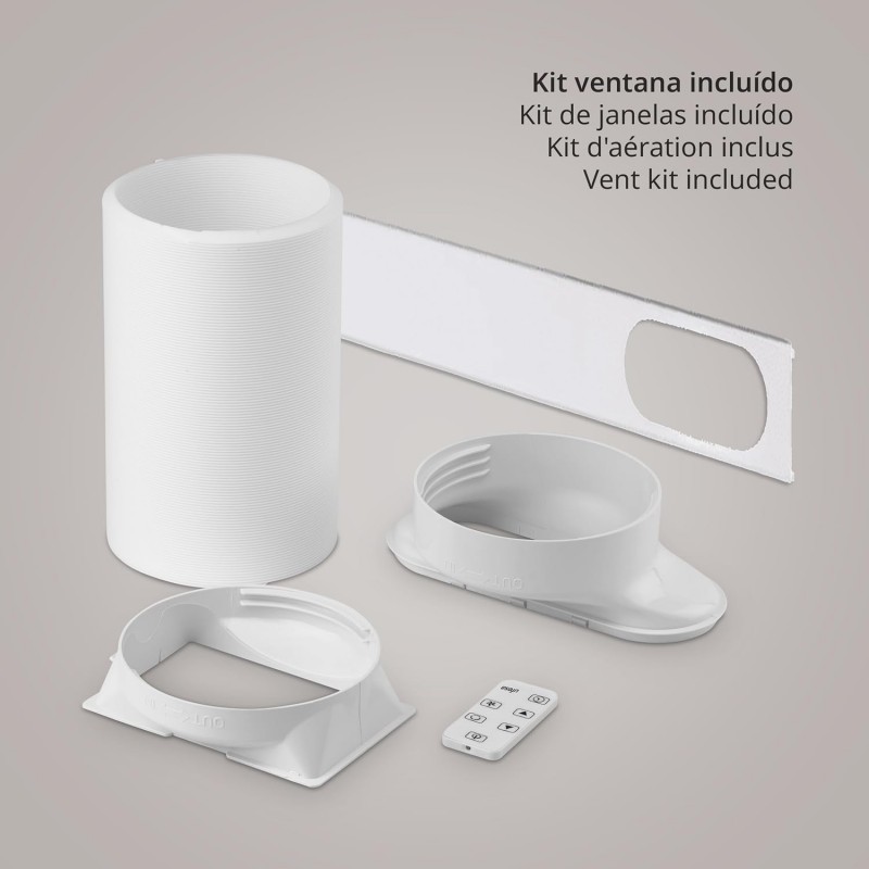 Este modelo é portátil, com 4 rodas integradas que permitem uma deslocação fácil entre diferentes divisões da casa. A instalação é imediata e simples, graças ao kit de janela incluído, com comprimento de 1,5 metros.