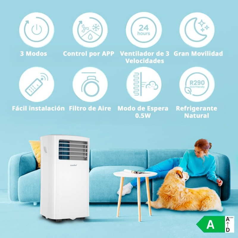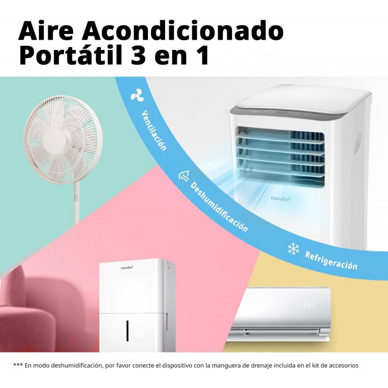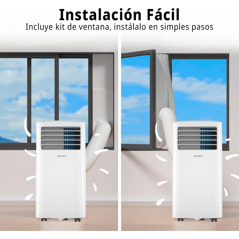 Ar condicionado portátil Comfee com potência de 8000 BTU, ideal para divisões até 30 m². Oferece refrigeração, ventilação e desumidificação, com classe energética A, controlo remoto, rodas integradas e instalação fácil com kit de janela incluído.