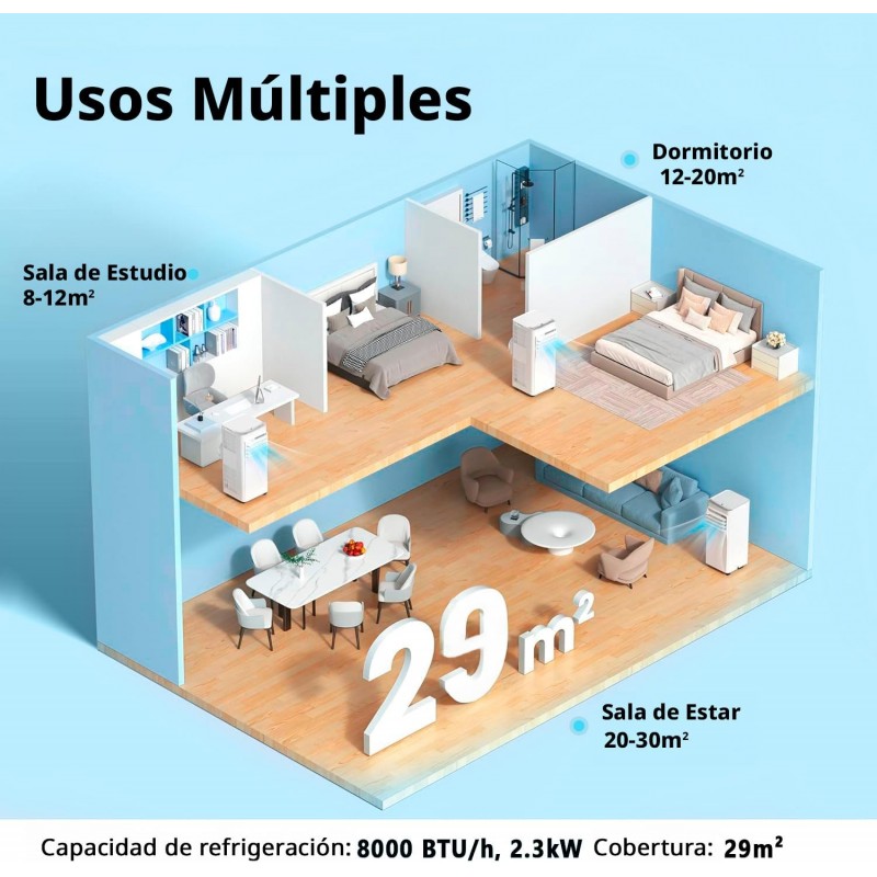 O ar condicionado portátil Comfee é a solução ideal para manter a sua casa fresca e confortável nos dias mais quentes. Com uma potência de refrigeração de 8000 BTU (equivalente a 2000 frigorias ou 2,3 kW), é recomendado para espaços até 30 m², como quartos, salas de estar ou escritórios.