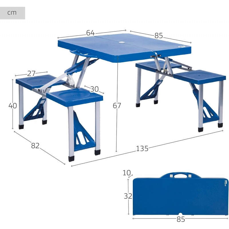 Design Prático e Espaçoso: O conjunto, quando aberto, mede 81,5 x 135,5 x 67 cm, oferecendo espaço suficiente para 4 pessoas. Fechado, torna-se uma mala compacta de 84,5 x 32 cm.