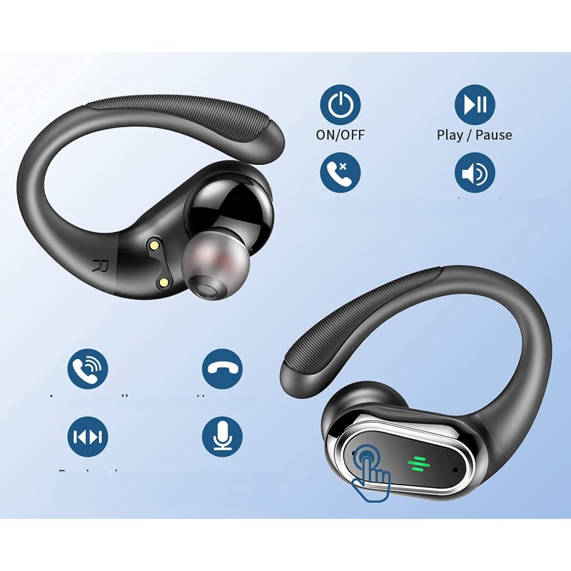 Os auscultadores sem fios apresentam um inovador gancho para a orelha feito de material TPE (elástico), que resolve o problema de queda dos capacetes durante o exercício.