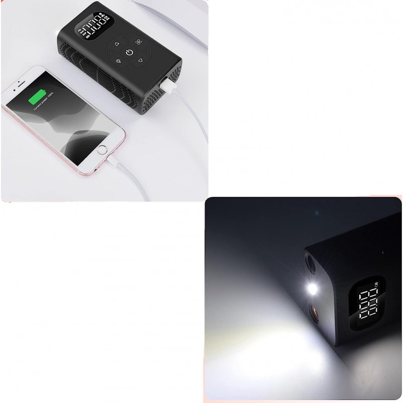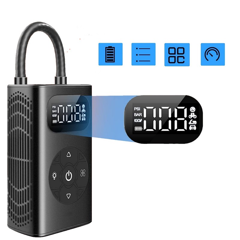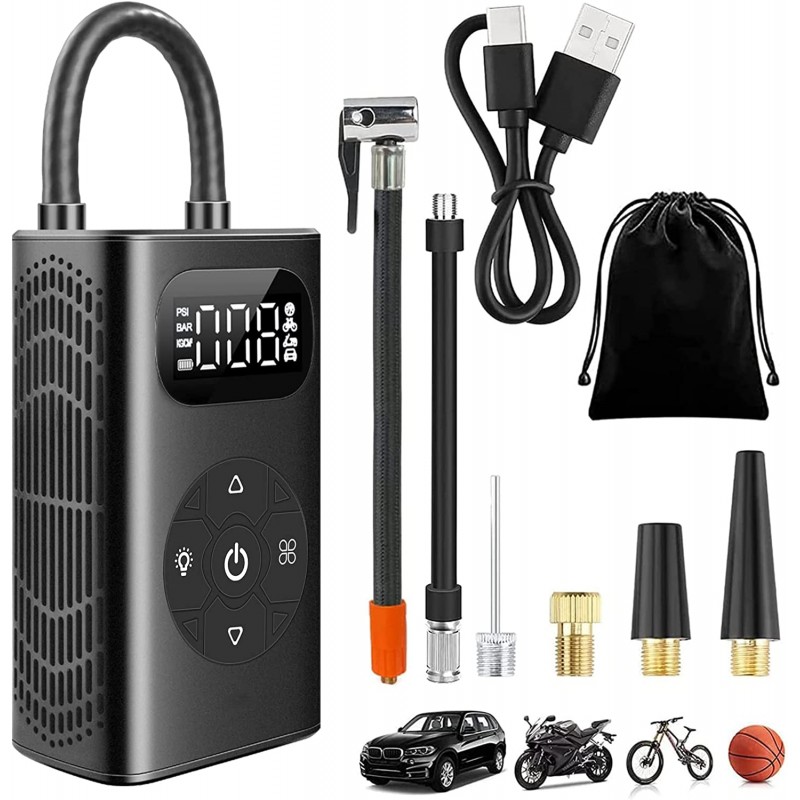 Carrega rapidamente através de uma ligação Tipo-C de 7,4V e, quando totalmente carregada, pode encher até 4 pneus de carro, 10 pneus de moto, 20 pneus de bicicleta de montanha ou 50 bolas de basquetebol, tornando-se um companheiro essencial para todas as suas viagens.