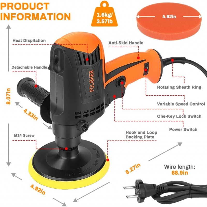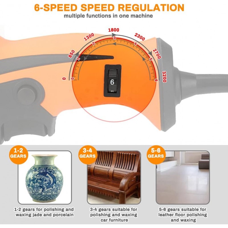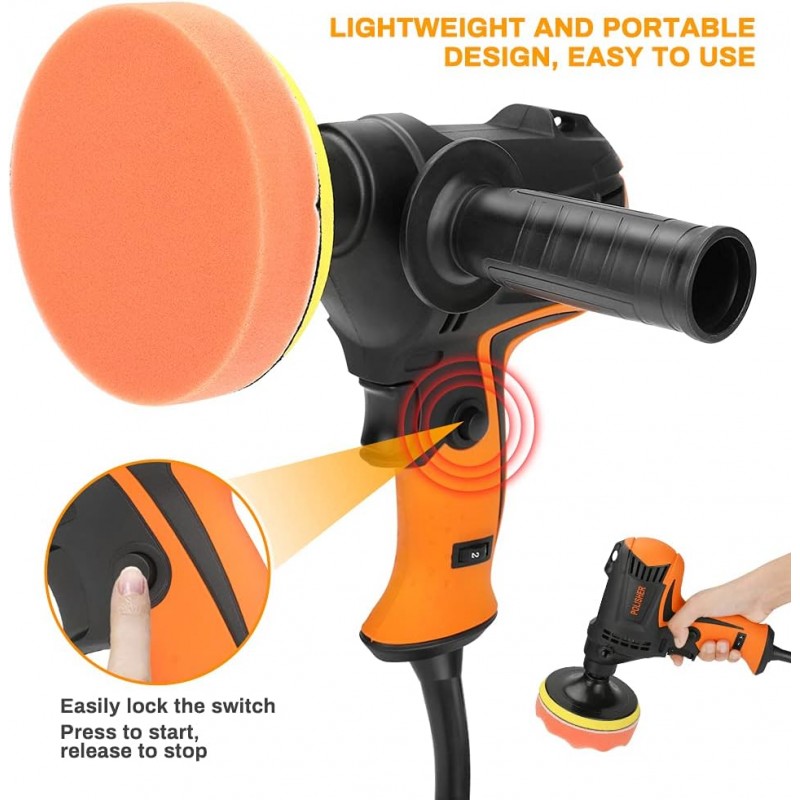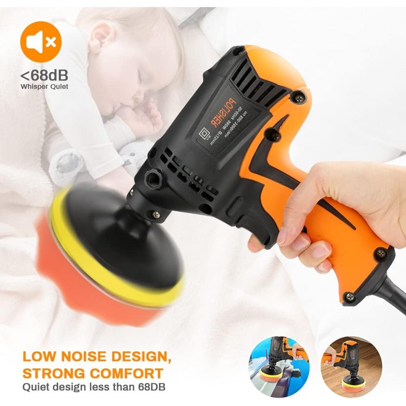 Este polidor elétrico de 980W é a escolha ideal para quem procura potência, eficiência e versatilidade. Com 6 velocidades variáveis entre 850 e 3200 rotações por minuto, adapta-se a várias tarefas, como polimento, enceramento, remoção de riscos, lixagem e acabamento profissional.