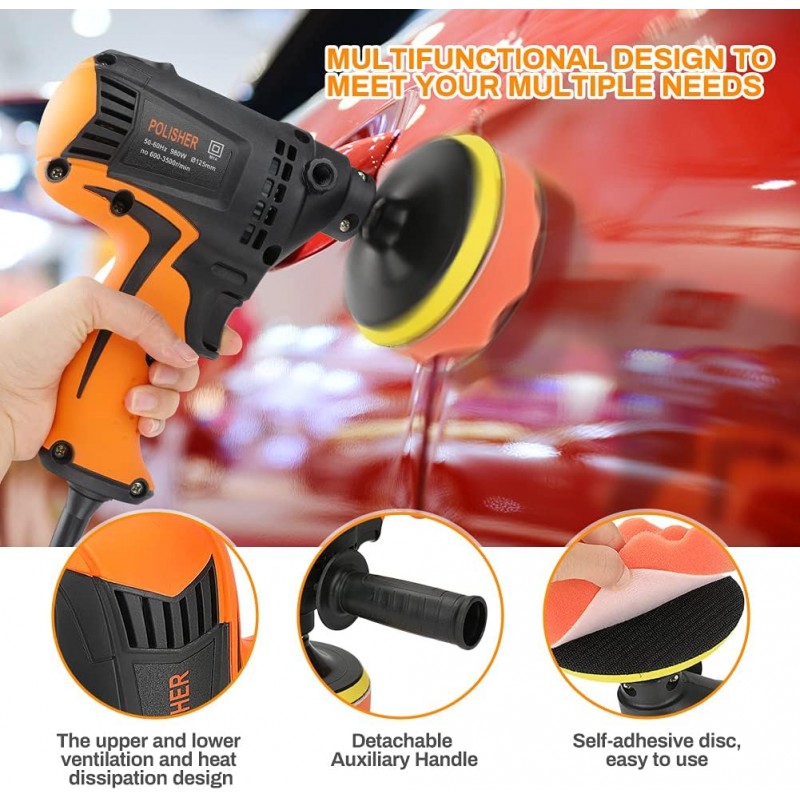 Polidor elétrico de 980W com 6 velocidades variáveis, ideal para polir e encerar automóveis, carros, móveis, cerâmica, madeira e metal. Inclui kit completo com esponjas, lixas, disco de lã, alça lateral e chave hexagonal.