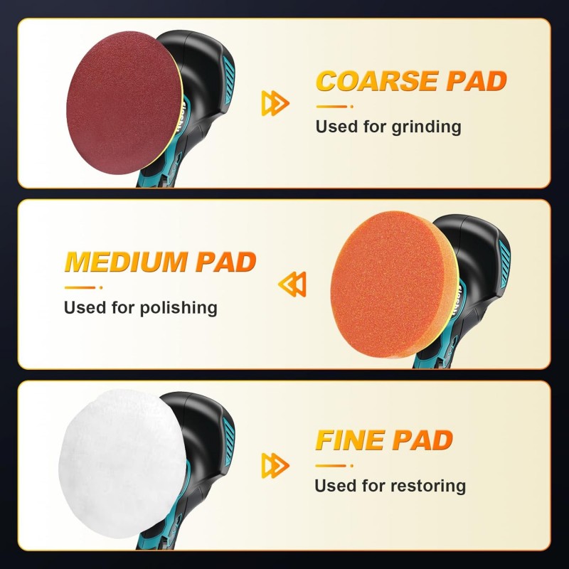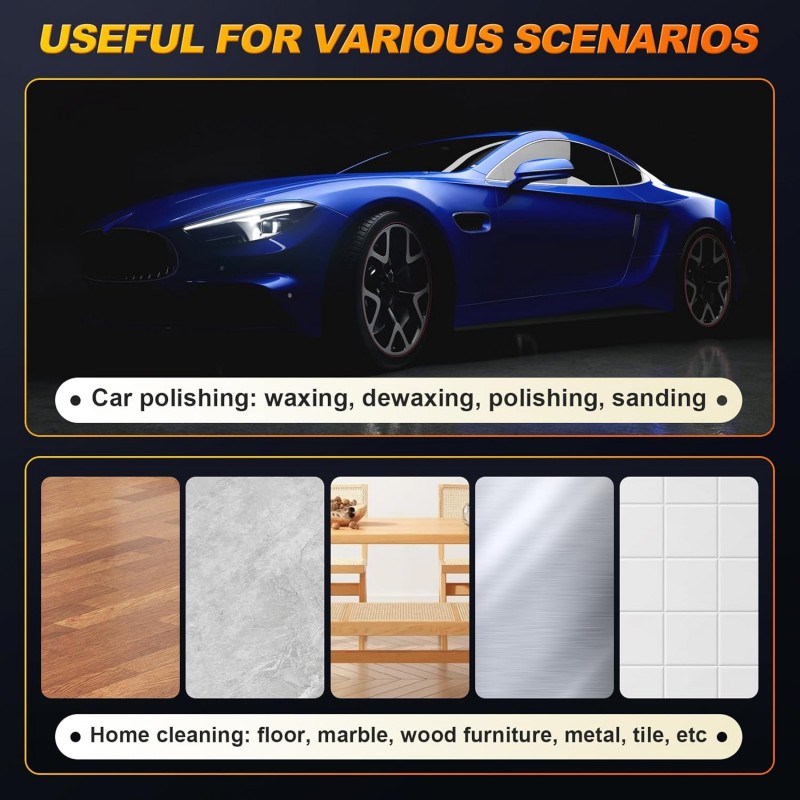 O design ergonómico, leve e portátil, aliado à superfície de gancho e laço para fácil substituição de almofadas, torna esta ferramenta prática para várias aplicações, como polir carros, motos, barcos, móveis, chão, azulejos, cerâmica e superfícies metálicas.