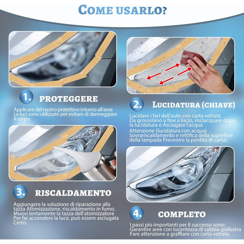Para obter o melhor resultado, certifique-se de que as áreas riscadas e amarelecidas sejam completamente polidas com lixa antes de aplicar a solução de reparação. Recomenda-se o uso de luvas, máscara e a realização do processo em local bem ventilado.