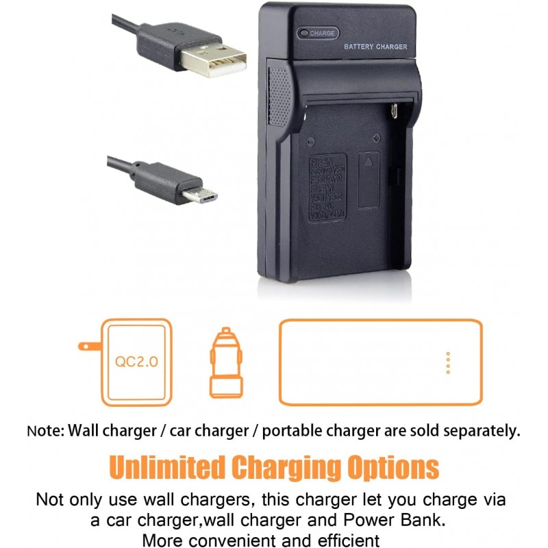 Kit composto por bateria NP-FM50 Li-Ion e carregador micro USB, compatível com várias câmaras e videocâmaras Sony. Solução prática para carregar através de USB com segurança e desempenho estável.