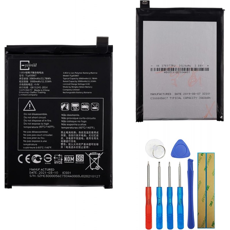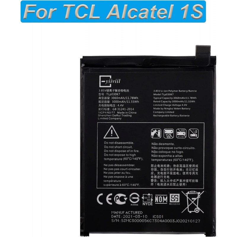 Renove a vida útil do seu TCL Alcatel 1S com a bateria de substituição TLP030K7. Inclui uma bateria de polímero de lítio de 3060 mAh e ferramentas para instalação.