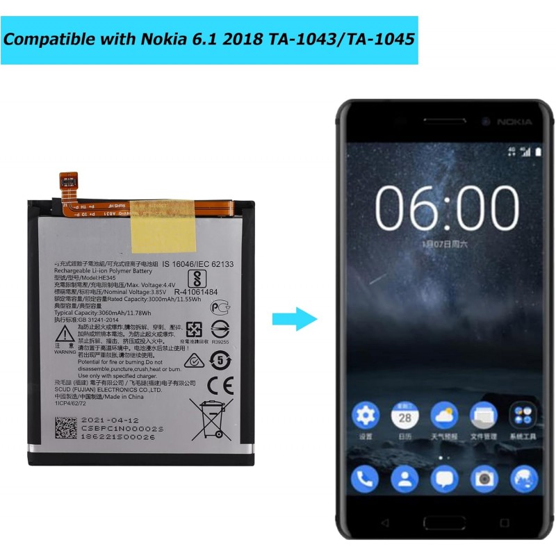 A Bateria HE345 é uma solução ideal para substituir a bateria do seu Nokia 6.1 2018, oferecendo uma capacidade de 3000 mAh e uma tensão de 3,85 volts para garantir uma longa duração e performance otimizada.