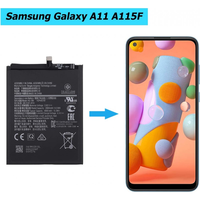 Bateria de substituição HQ-70N de 3900 mAh, compatível com Samsung Galaxy A11 (A115F, SM-A115M, SM-A115U). Inclui kit de ferramentas para instalação. Ideal para restaurar o desempenho original do seu dispositivo.