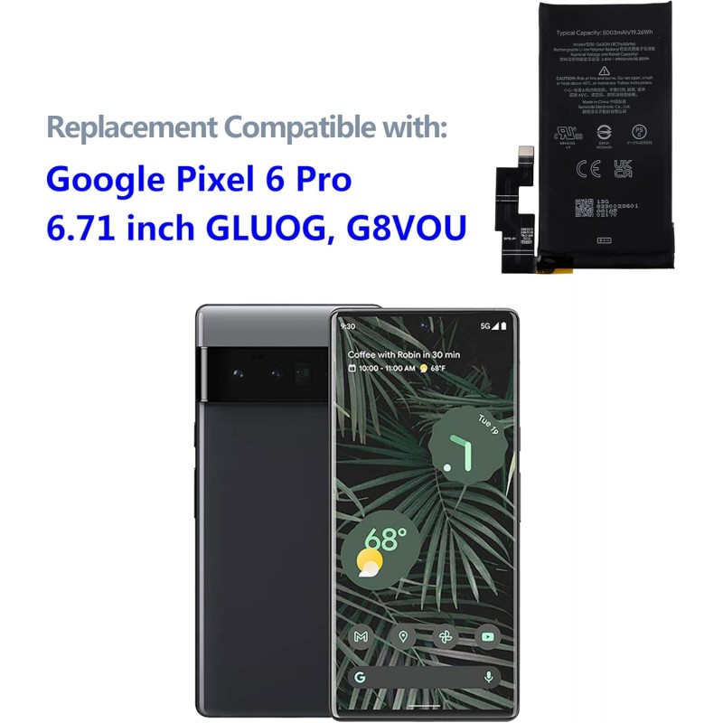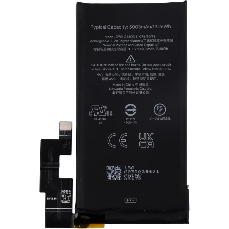 Bateria de substituição de alta qualidade para o Google Pixel 6 Pro, ideal para restaurar a autonomia original do equipamento. A bateria é do tipo polímero de lítio, com uma capacidade nominal de 4905mAh e tensão de 3.85 volts.