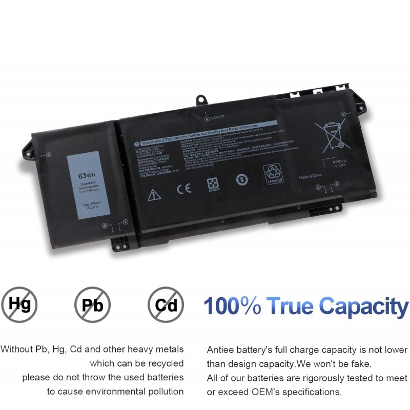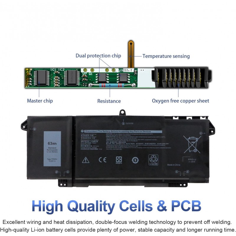 Bateria recarregável de iões de lítio, modelo 7FMXV, com capacidade de 63Wh e tensão de 15,2V. Compatível com portáteis Dell Latitude 5320, 7320, 7420 e 7520.