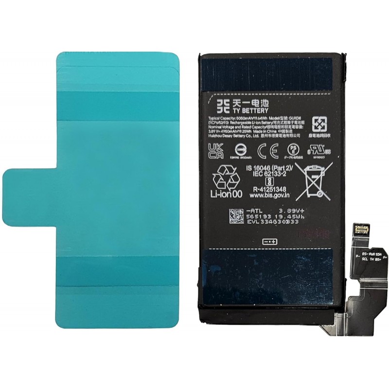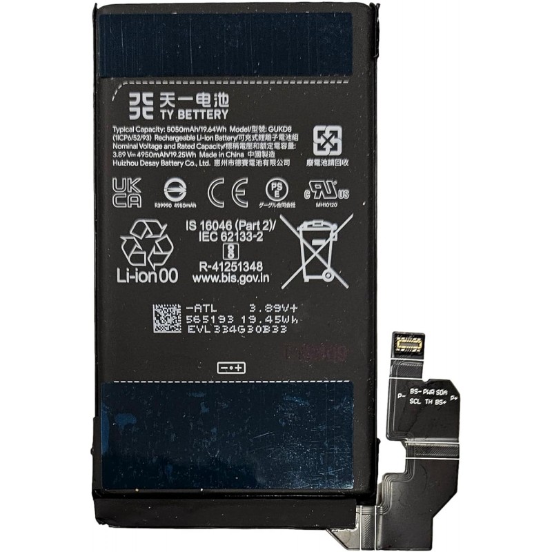 Bateria compatível com Google Pixel 8 Pro, modelo GUKD8, capacidade 5050 mAh, tensão 3,8V, recarregável, ideal para substituição da bateria original. Recomenda-se instalação por técnico qualificado.