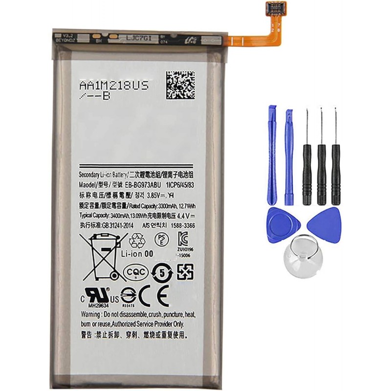Bateria de substituição de 3400 mAh compatível com Samsung Galaxy S10 SM-G973F. Fornecida com kit completo de ferramentas para montagem. Bateria nova e segura, com proteção contra sobreaquecimento, sobrecarga e curto-circuito.