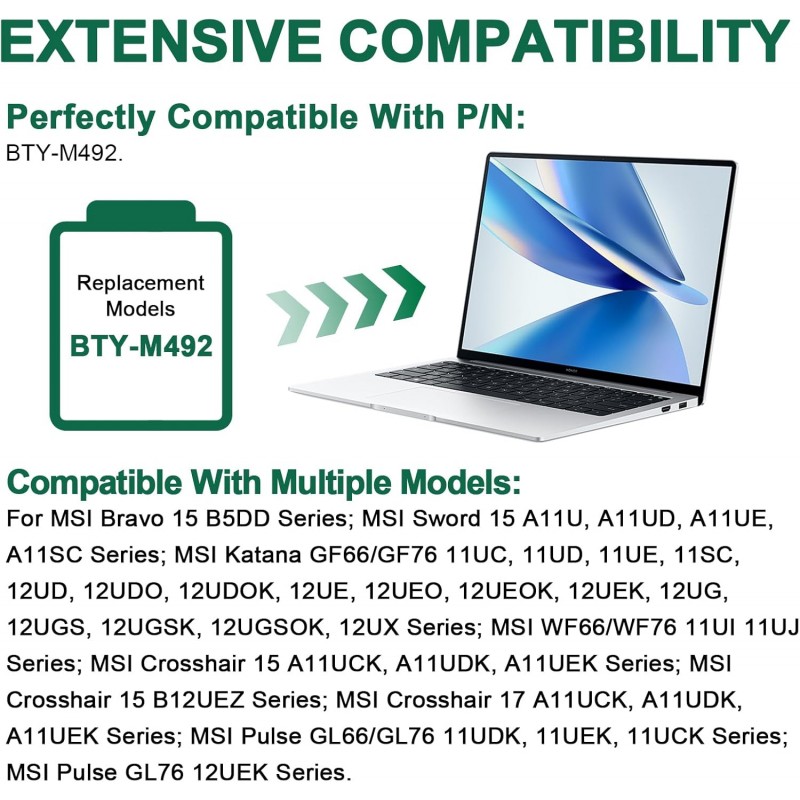 Bateria compatível de elevada qualidade para portátil MSI, modelo BTY M492. Ideal para substituir a bateria antiga ou com pouca autonomia.