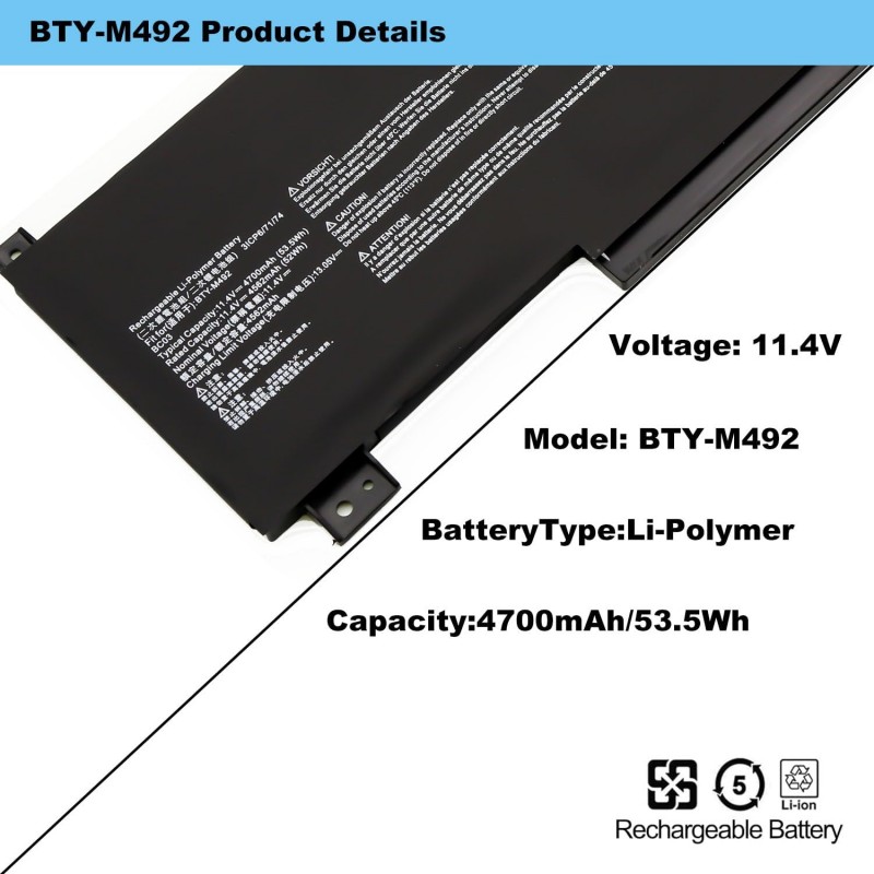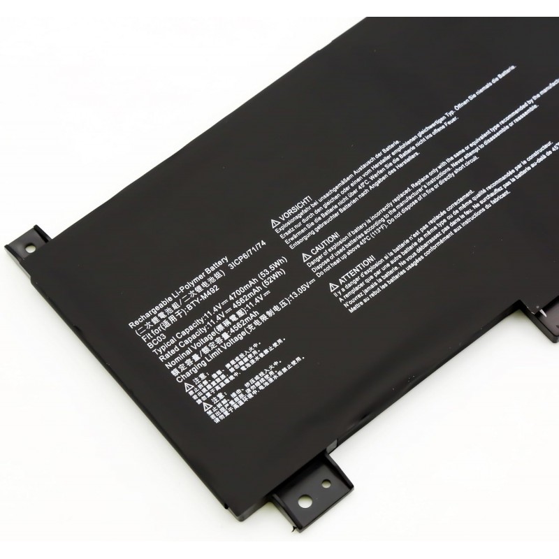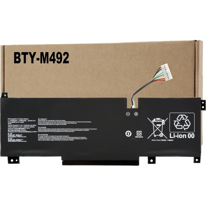 Bateria de substituição compatível para portátil MSI, modelo BTY M492. Indicada para quem precisa substituir a bateria original por perda de autonomia ou avaria. Esta bateria de iões de lítio tem tensão de 11.4 volts e capacidade de 4700 mAh 53.5 Wh, podendo atingir até cerca de 500 ciclos de recarga durante a vida útil.