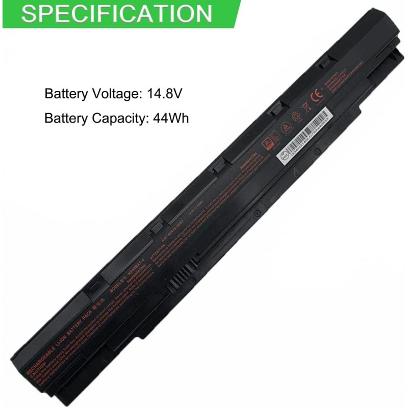 Bateria de substituição para portátil Clevo e compatíveis, com tecnologia iões de lítio, 14.8 volts, 44 Wh e peso aproximado de 250 gramas.