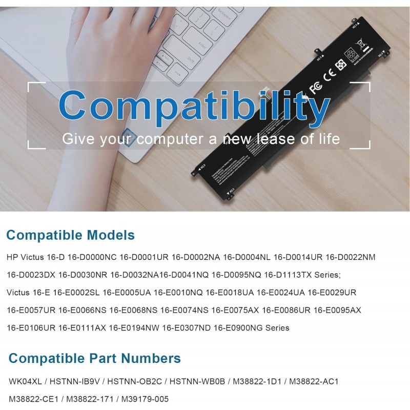 Bateria compatível HP WK04XL com 15.4 volts e 70.07Wh, indicada para portáteis HP Victus 16-D e 16-E, com tecnologia de iões de lítio.