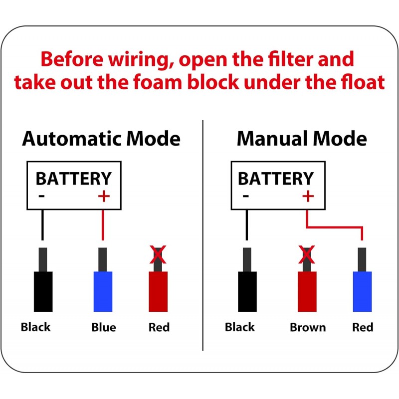 tanque de aquário de injeção de água descarga de águas residuais de porãoNota: Cabo preto: Ligue o polo negativo; cabo vermelho: ligar o polo positivo (modo manual); cabo azul: ligar o polo positivo (modo automático)