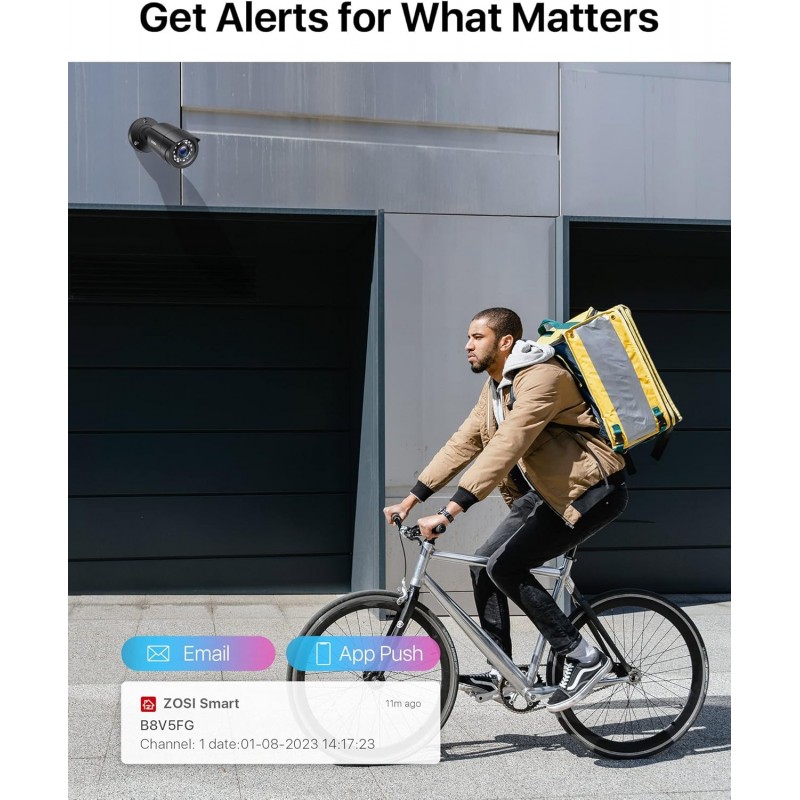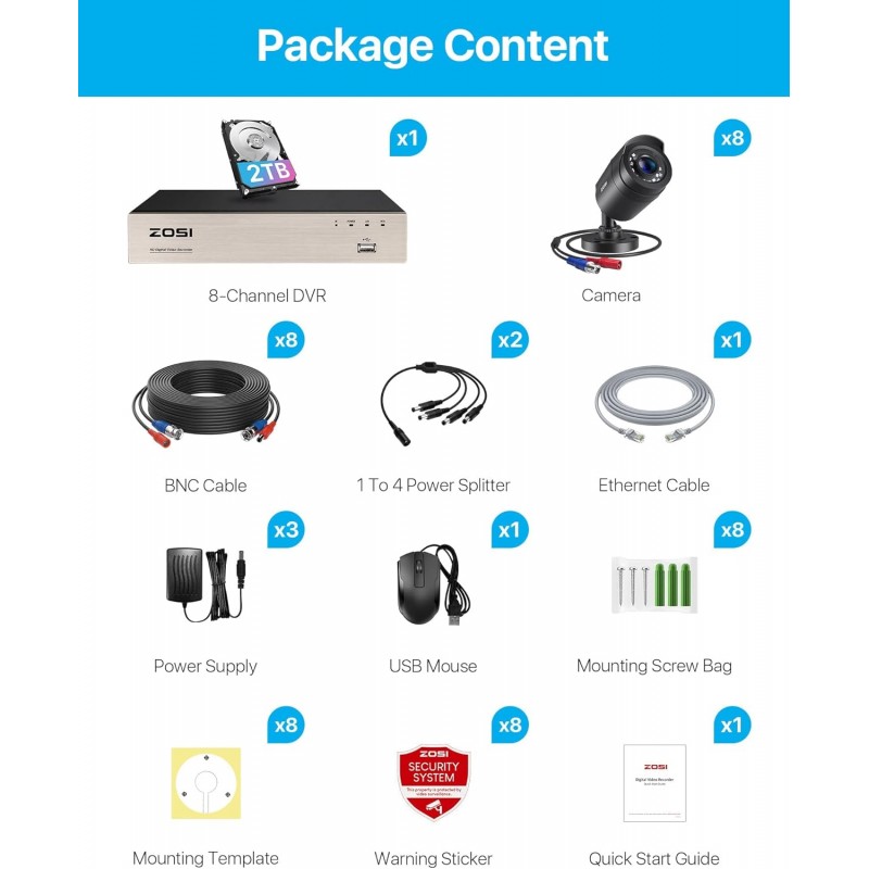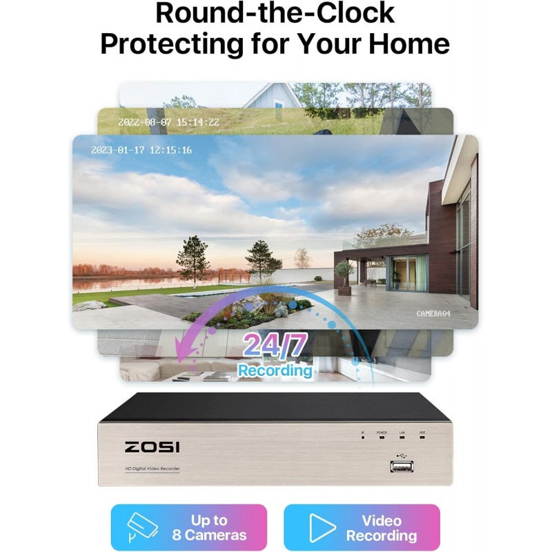Sistema de videovigilância completo da marca ZOSI com qualidade Full HD 1080P. Ideal para proteger casas, escritórios, armazéns ou lojas. Composto por 8 câmaras resistentes ao clima (IP66), visão noturna até 24 metros, deteção de movimento com alertas por app e e-mail, e acesso remoto fácil através da aplicação ZOSI Smart ou AVSS.