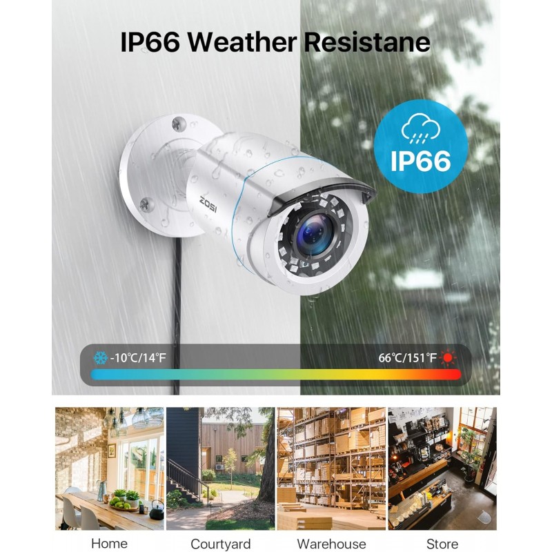 As câmaras têm proteção IP66 contra chuva e poeiras e são adequadas para uso interior ou exterior.