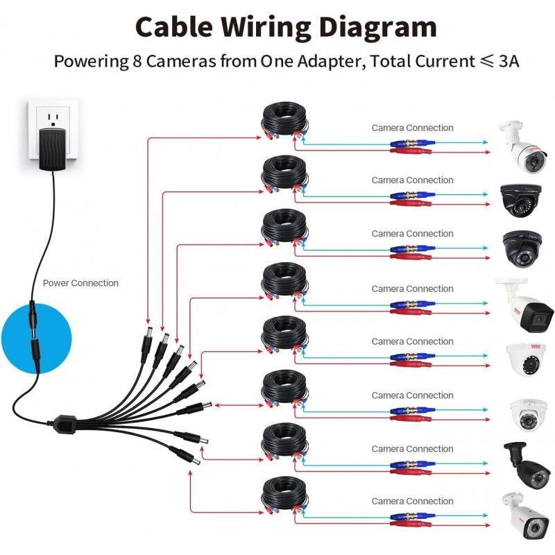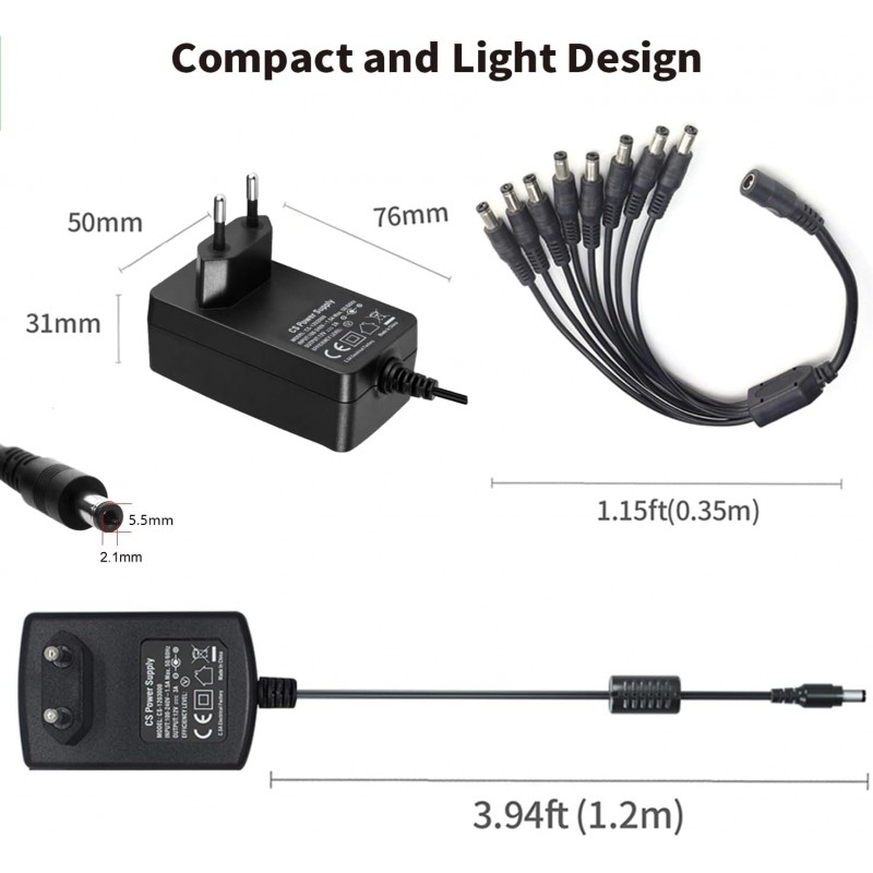Adaptador de corrente contínua 12V 3A com divisor de cabo para câmaras de vigilância CCTV, gravadores NVR/DVR, routers, tiras LED e TV-Box. Proteção contra sobrecarga e curto-circuitos.