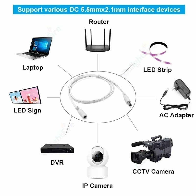 Cabo de extensão de alimentação DC macho para fêmea com 10 metros de comprimento. Compatível com 5V a 24V, ideal para câmaras, fitas LED, routers e outros dispositivos com ficha de 5.5mm x 2.1mm.