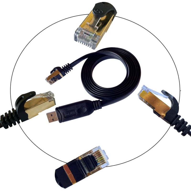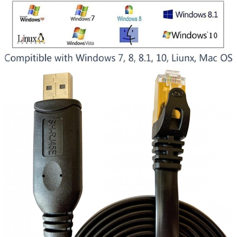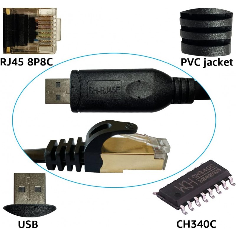 Cabo USB para consola SH-RJ45E de 1,8 metros, equipado com chip WCH CH340C e ZT213. Compatível com routers, comutadores e firewalls de marcas como Cisco, Ubiquiti, Juniper, Fortigate, Mikrotik, TP-Link e Huawei. Suporta comunicação RS232 a uma velocidade máxima de 2 Mbps. Inclui LED indicador de Tx e Rx e instalação Plug & Play após a configuração do controlador.