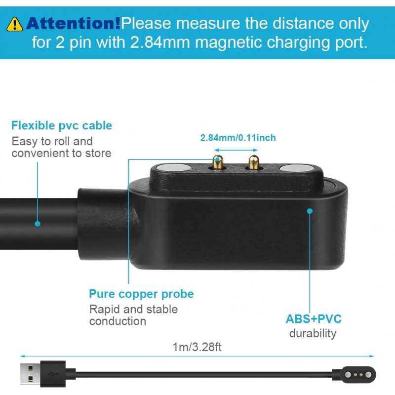 Verifique os modelos compatíveis antes de encomendar este cabo. Meça a distância entre as portas de carregamento magnéticas do seu relógio inteligente antes de comprar. Método de medição: meça se a distância entre os pontos centrais das duas portas de carregamento do íman é igual a 2,84 mm ou 0,11 polegadas.