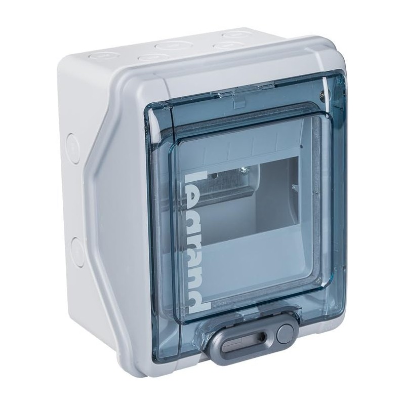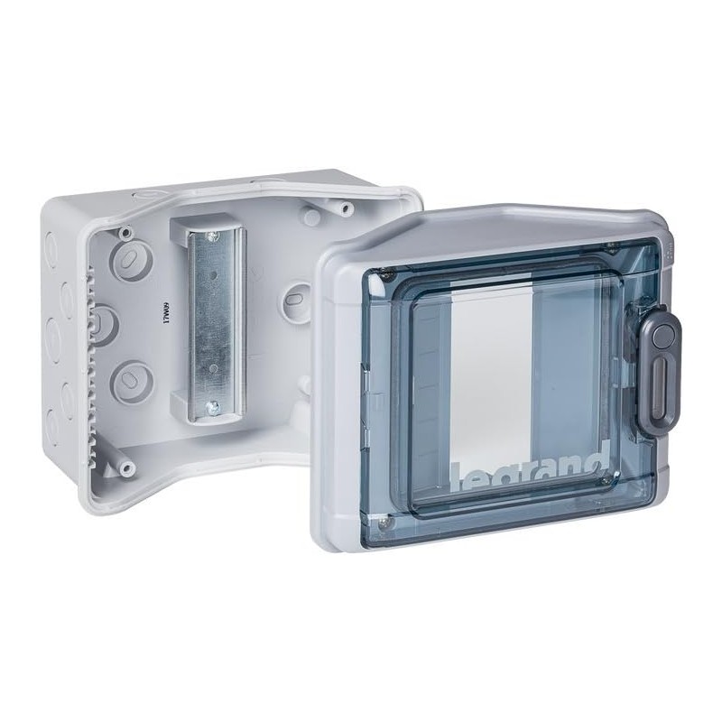 Caixa modular estanque de plástico na cor cinzento, ideal para instalações externas. Oferece proteção IP65 contra jatos de água e entrada de pó, garantindo a segurança e durabilidade em ambientes expostos à humidade e intempéries.