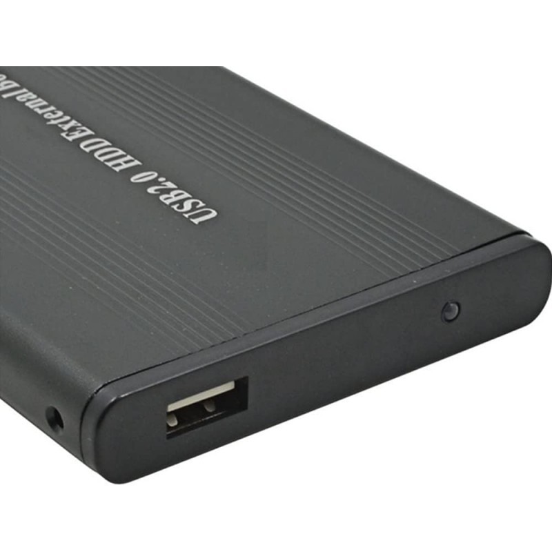 Capa de alumínio para discos rígidos IDE de 2,5" com porta USB, compatível com até 500 GB. Ideal para portáteis e PCs, com suporte a Hot Swap e Plug & Play.