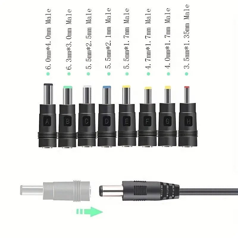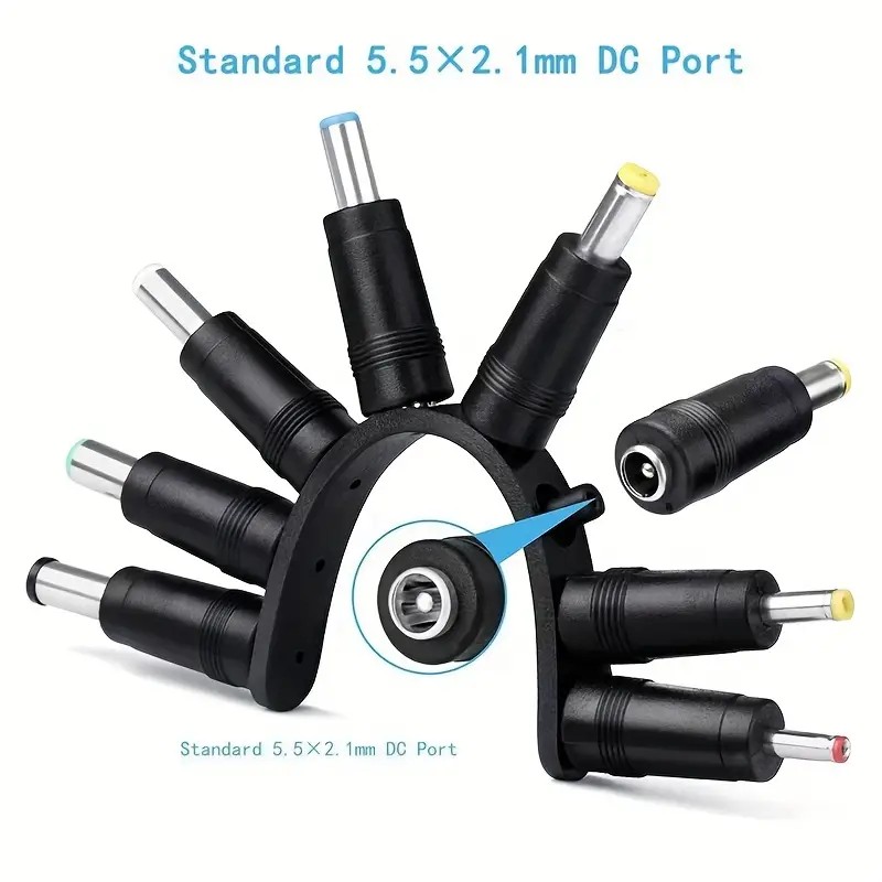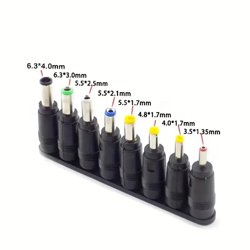Este conjunto inclui um kit de 8 adaptadores de alimentação DC tipo jack com diferentes tamanhos, ideal para quem necessita de múltiplas opções de conexão com um único carregador ou fonte de alimentação. Todos os adaptadores encaixam num conector base padrão de 5.5x2.1mm, o mais comum em fontes de alimentação universais.