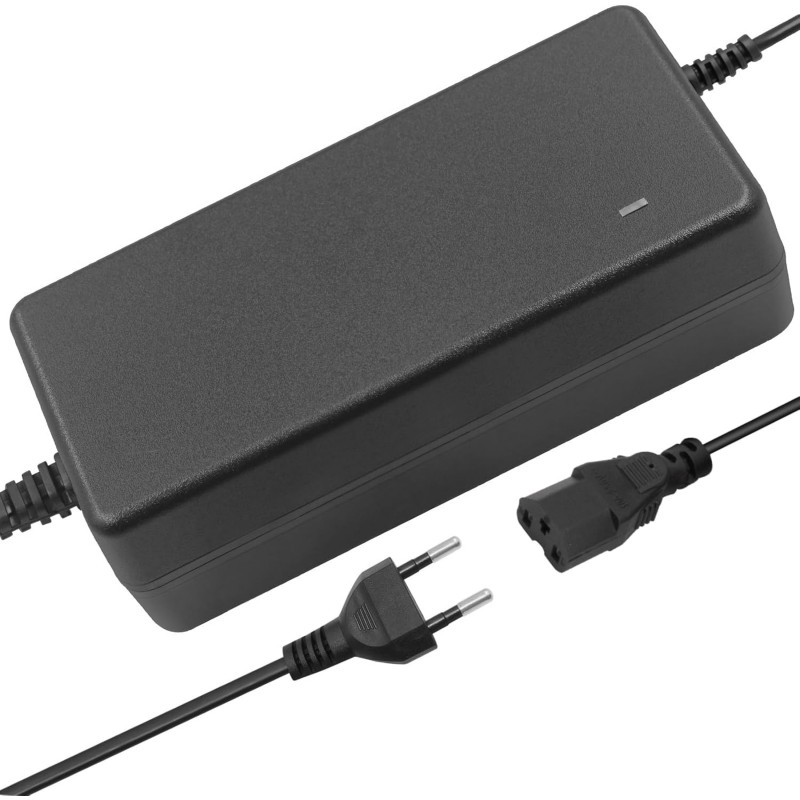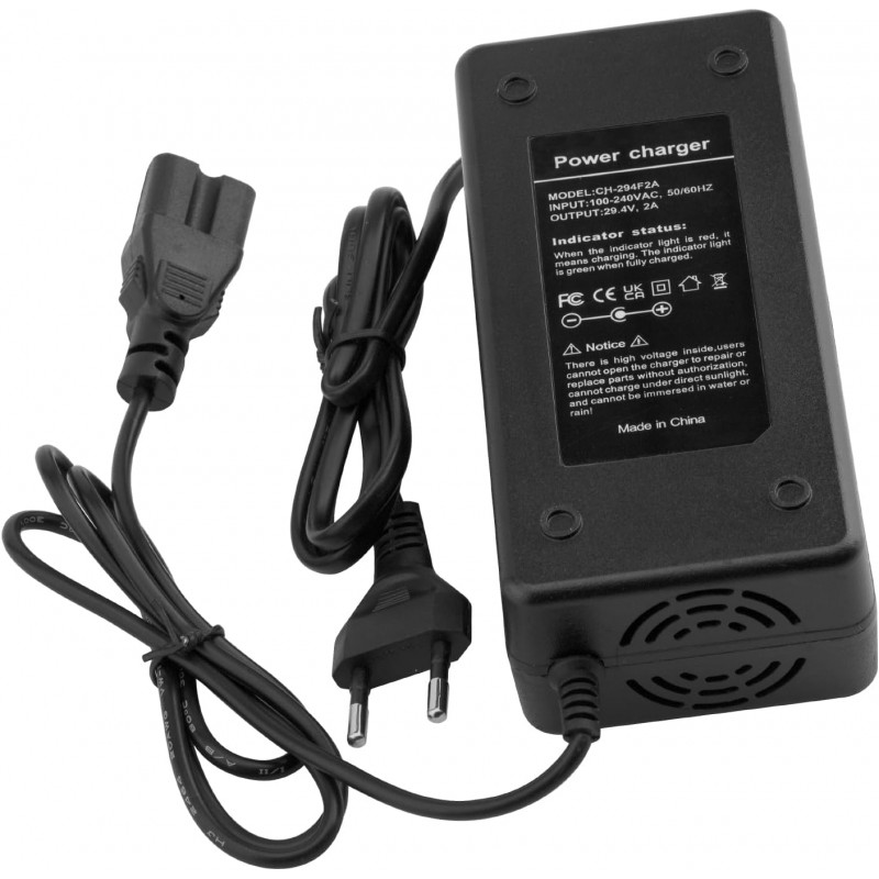 Carregador de alta qualidade para baterias de iões de lítio, com saída de 29.4 volts e corrente de 2 amperes. Compatível com vários equipamentos elétricos como trotinetes, hoverboards, scooters, bicicletas elétricas e motos elétricas de baixa cilindrada.