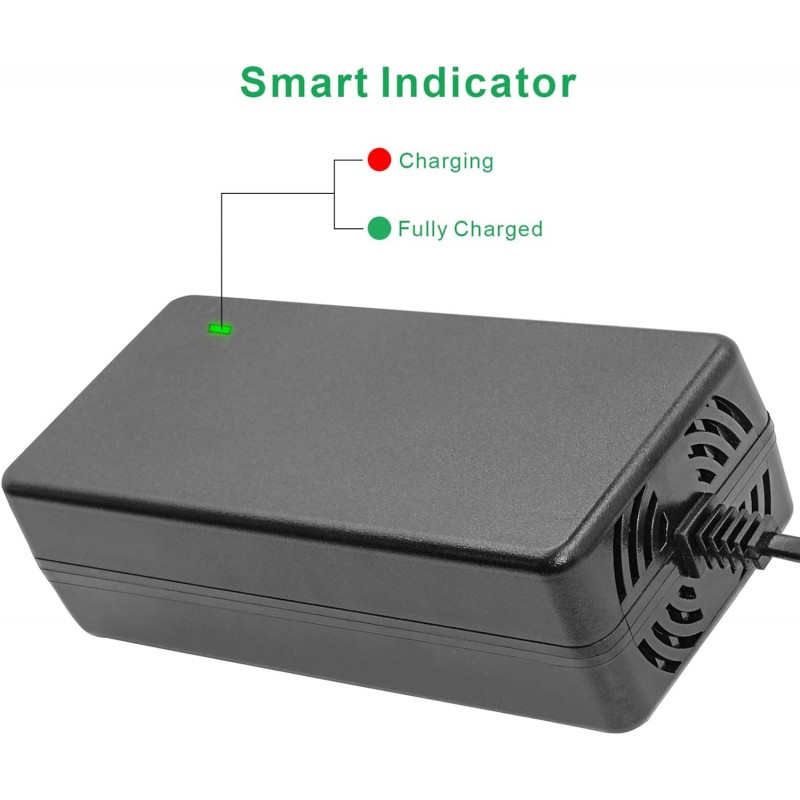Carregador 29.4V 2A com plugue 3P, ideal para trotinetes, hoverboards, scooters e motos elétricas. Com ventoinha inteligente e múltiplas proteções de segurança.
