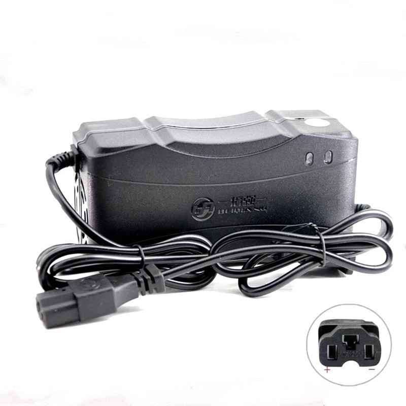 Carregador de bateria inteligente 84V 5A, ideal para baterias de lítio de 72V em trotinetes, bicicletas e scooters elétricas com ficha triangular.